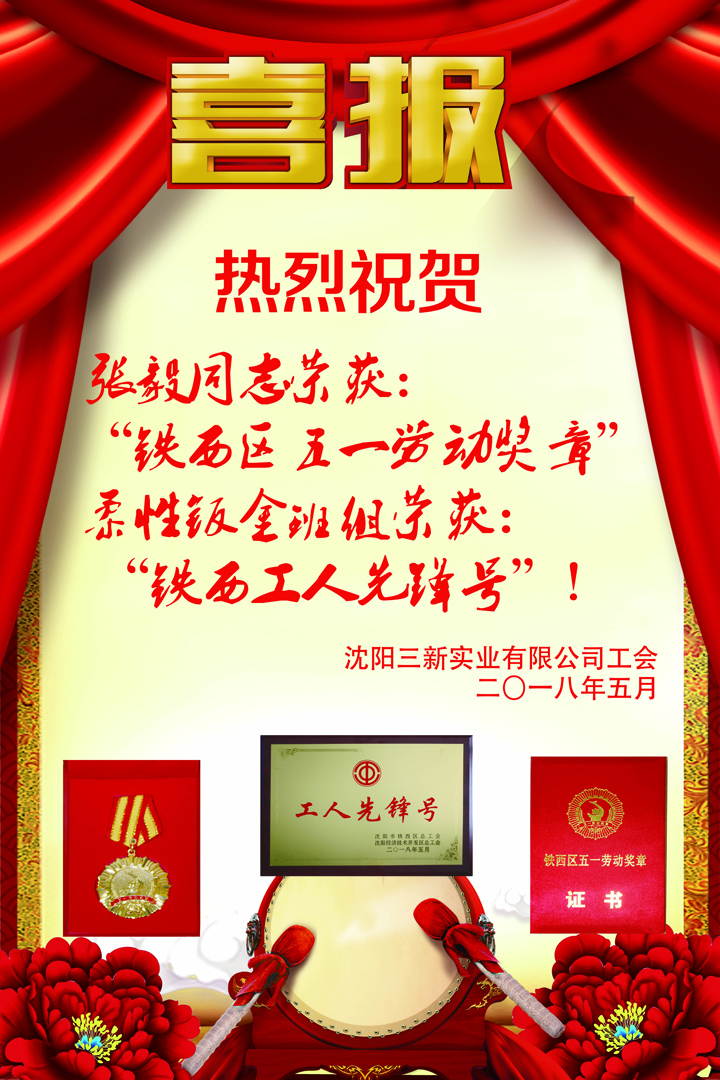 沈陽三新實業(yè)有限公司榮獲“鐵西五一勞動獎狀”,張毅同志榮獲“鐵西區(qū)五一勞動獎?wù)隆保嵝遭k金班組于永欣等9名同志榮獲“鐵西工人先鋒號”!