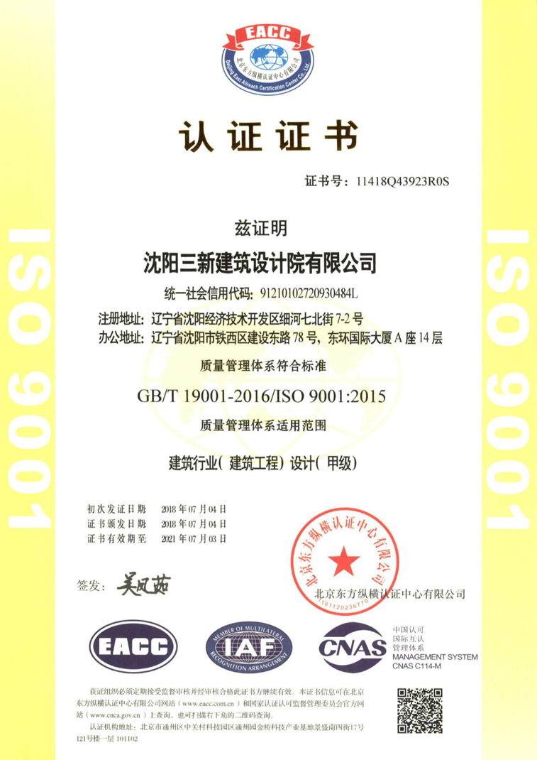 2018年6月28日~29日,北京東方縱橫認(rèn)證中心對沈陽三新建筑設(shè)計(jì)院進(jìn)行質(zhì)量管理體系認(rèn)證審核,經(jīng)過兩天的審核,專家對公司的管理體系運(yùn)行情況給予好評,滿足標(biāo)準(zhǔn)要求,同時(shí)也給出了切實(shí)的改進(jìn)建議。公司組織各部門對審核過程中發(fā)現(xiàn)的不符合進(jìn)行了總結(jié)討論,并針對存在的問題舉一反三,制定并實(shí)施整改計(jì)劃及預(yù)防措施,效果顯著。