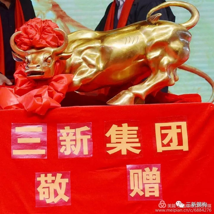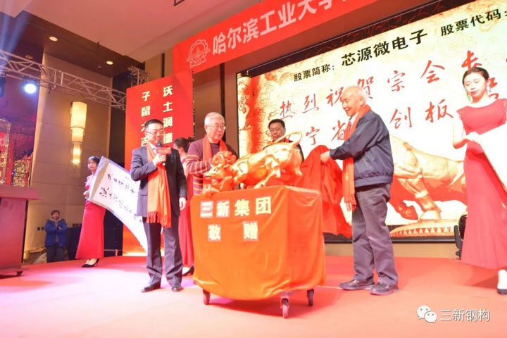 本屆校友會(huì)的承辦方,沈陽(yáng)三新集團(tuán)總經(jīng)理,校友會(huì)副會(huì)長(zhǎng),本屆年會(huì)籌備組組長(zhǎng)洪長(zhǎng)禧先生代表沈陽(yáng)校友特為宗會(huì)長(zhǎng)及芯源微電子贈(zèng)送銅牛一尊!祝芯源微電子財(cái)源廣進(jìn),牛市長(zhǎng)紅!