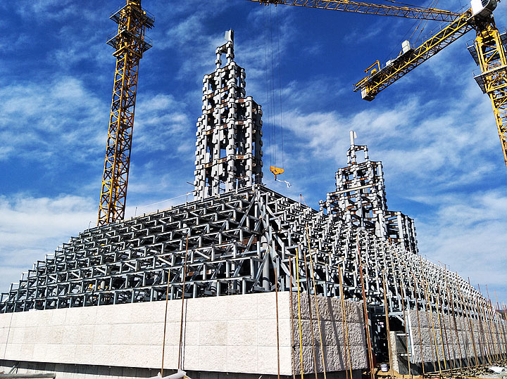 黃帝問道大項目是“帝師之鄉(xiāng)”汝州的重點大型城雕項目,也是當?shù)氐貥诵越ㄖT擁椖考缲撝霌P汝州歷史文化和華夏文明的重任,承載了太多榮耀和希冀。雕像基底面積1400平方米,人像總高度59.8米,主體結(jié)構(gòu)采用圓管鋼框架,外側(cè)采用干掛石材雕塑,總用鋼量2300噸,設(shè)計使用年限為100年。雕塑內(nèi)部水、電、消防配套齊全。要用鋼結(jié)構(gòu)、石塑傳神地塑造中華民族敬為人皇的黃帝雕像,不失神韻和靈氣,其難度可想而知。三新不負重托,攻克所有的技術(shù)難題,把大師畫卷中的意象用建筑語言完美呈現(xiàn),體現(xiàn)了三新建筑技術(shù)與藝術(shù)完美融合的建筑理念。施工過程中汝州市政府各級領(lǐng)導多次到現(xiàn)場檢查指導,對工程質(zhì)量贊賞有加。我們一起見證了精品的煉成,其中凝聚了三新人的心血和智慧,更體現(xiàn)了三新的創(chuàng)新精神。如今被評為“中國鋼結(jié)構(gòu)金獎”工程,更是實至名歸。三新帶您一睹黃帝風采,領(lǐng)略華夏文明。