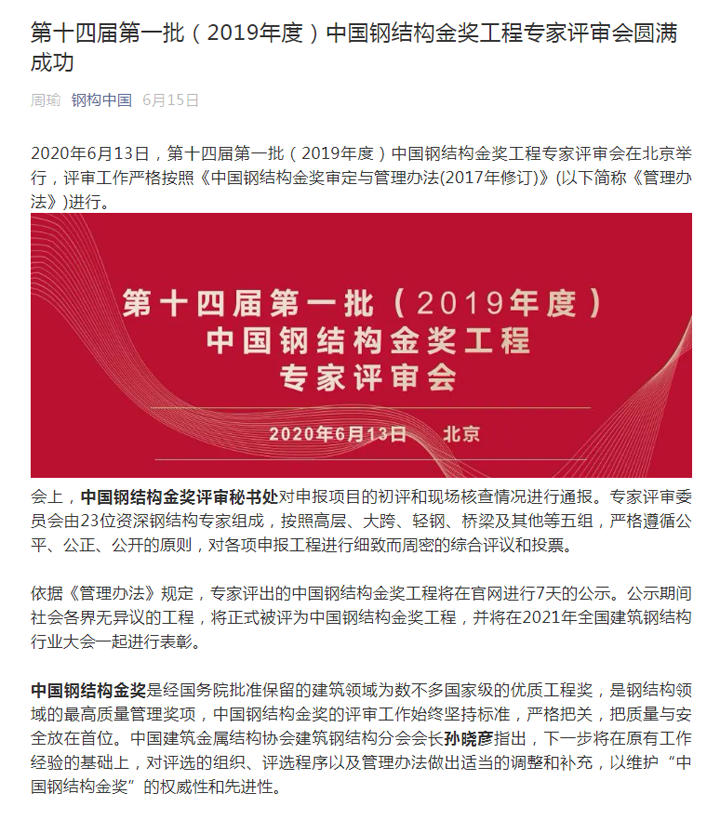 2020年6月13日,第十四屆第一批(2019年度)中國鋼結(jié)構(gòu)金獎工程專家評審會在北京舉行。